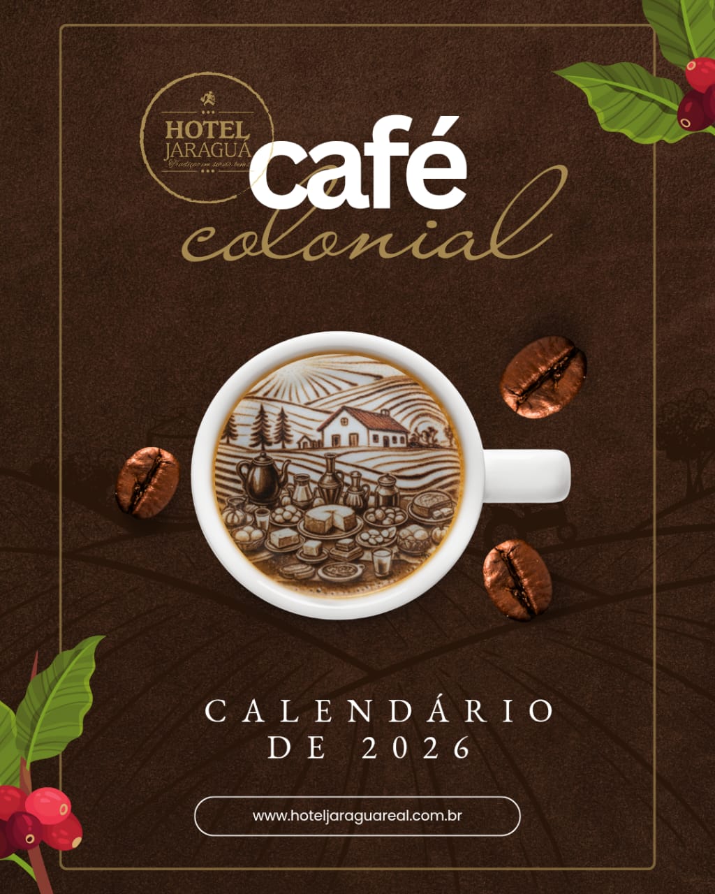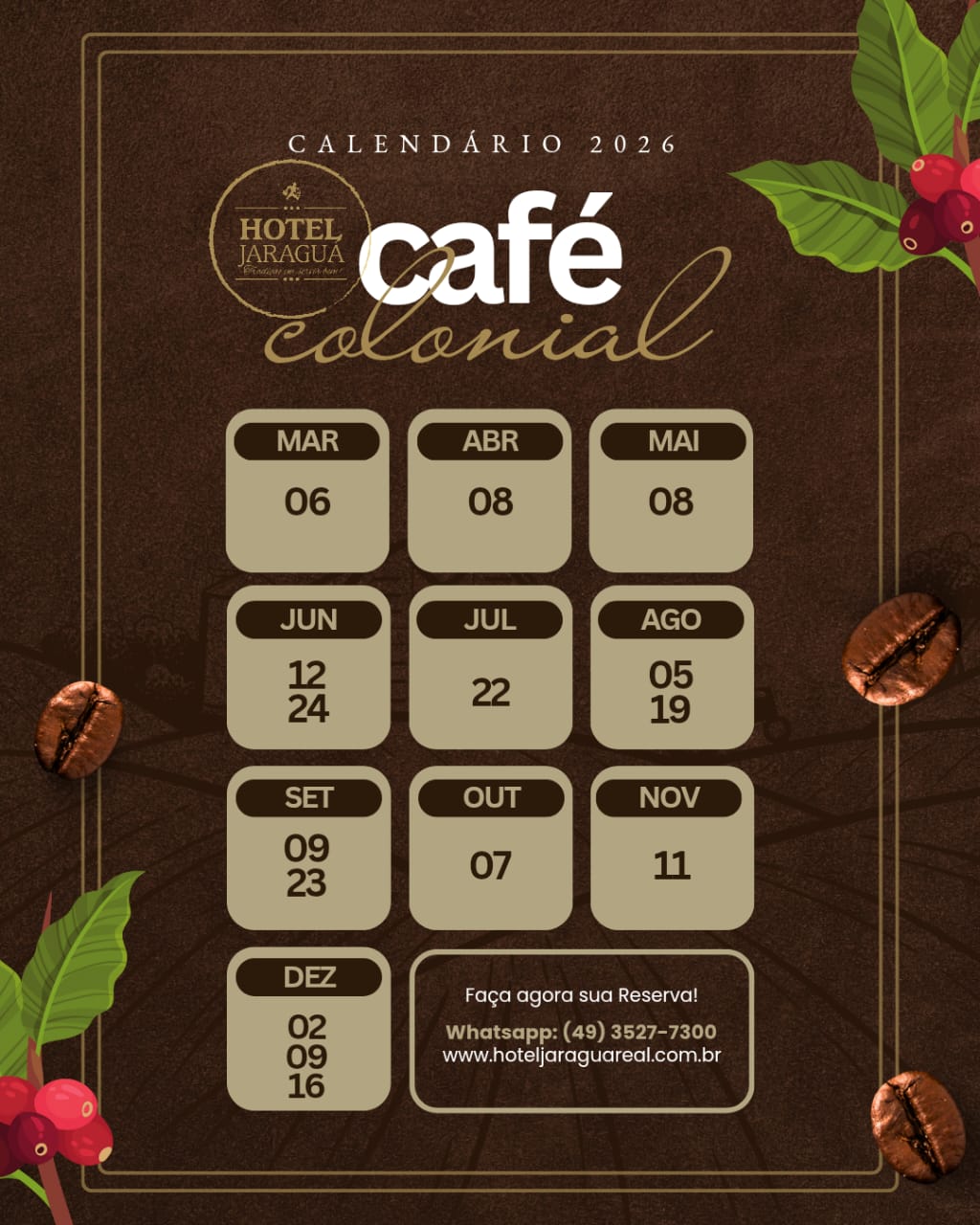 - O café colonial será servido nos dias 06/03/2026, 08/04/2026, 08/05/2026, 12/06/2026, 24/06/2026, 22/07/2026, 05/08/2026, 19/08/2026, 09/09/2026, 23/09/2026, 07/10/2026, 11/11/2026, 02/12/2026, 09/12/2026 e 16/12/2026 das 19h às 23h.